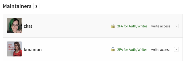 npm owner add <their-username> <package-name> --otp=123456# new maintainer accepts invitationnpm owner rm <your-username> <package-name> --otp=123456